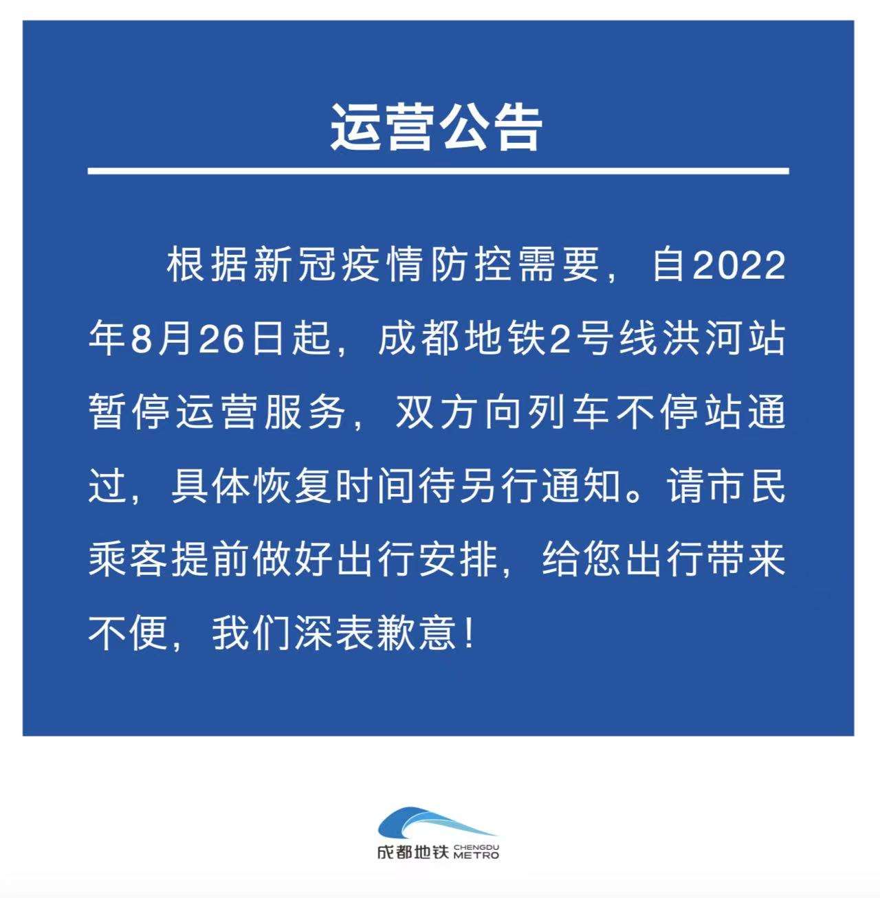 四川经济网讯(记者 李洋)8月26日,记者从成都轨道集团了解到,根据新冠疫情防控需要,自2022年8月26日起,成都地铁 2号线洪河站暂停运营服务,双方向列车不停站通过,具体恢复时间待另行通知。请市民乘客提前做好出行安排,给市民们出行带来不便,成都地铁深表歉意。