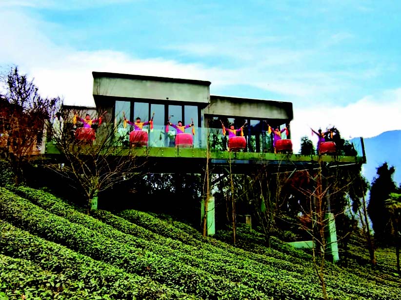 伴着隆隆鼓声,举行了荡气回肠的喊山采摘活动,峨眉雪芽的制茶大师现场为嘉宾们展示了非遗手工制茶技艺。四川省级非遗“峨眉山指画”传承人林栩即兴挥掌、以手代笔创作了一个“茶”字和一幅“美丽茶园”画图。国家级非遗“峨眉武术”传承人王超现场展示了刚劲有力的峨眉拳功夫。茶园里,嘉宾们饱览无限春光,体验新茶采摘,祈盼新年风调雨顺,万事吉祥。