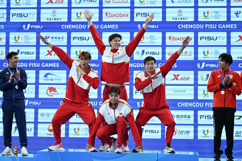 王谷开来、覃海洋、陈俊儿和林涛组成的中国队在男子4x100米混合泳接力决赛中迎来意大利队的强劲挑战。林涛在最后一棒顶住压力,最终中国队以3分32秒58的成绩夺冠,同时创造新的赛会纪录。