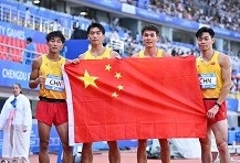 (封面图:8月6日,中国队选手陈佳鹏、邓智舰、严海滨、陈冠锋(从左至右)在比赛后庆祝。当日,在成都大运会田径项目男子4X100米接力决赛中,中国队以38秒80的成绩获得冠军。新华社记者 王曦 摄)