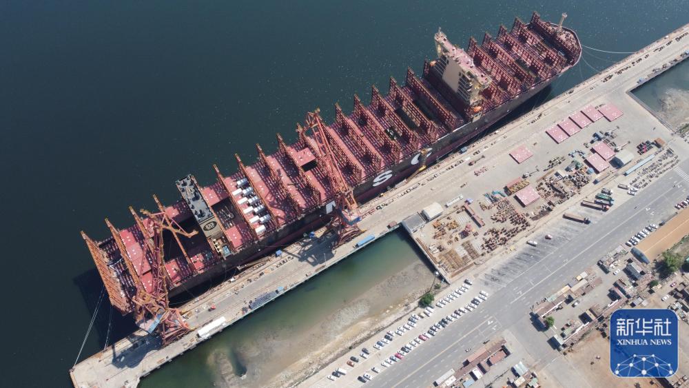这是6月21日在中船(天津)船舶制造有限公司厂区拍摄的一艘已经下水准备交付的船舶(无人机照片)。(新华社记者 赵子硕 摄)
