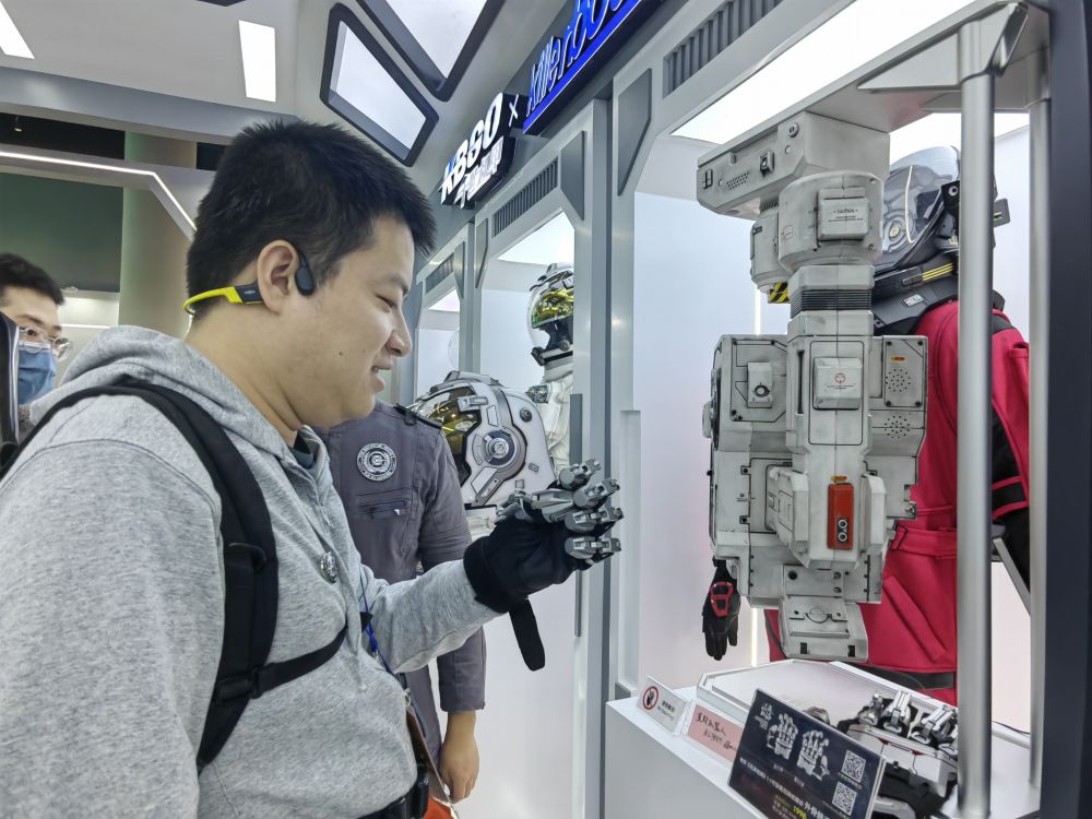 走进流浪地球展区,不仅有《流浪地球》手游,还展出了电影中的宇航服,更令人惊喜的是,一款电影中出现过的可穿戴外骨骼手掌装置也来到了现场。“戴上后很有科技感,还能远程操控,灵活又很有力量。”现场体验过的一位市民忍不住点赞说。