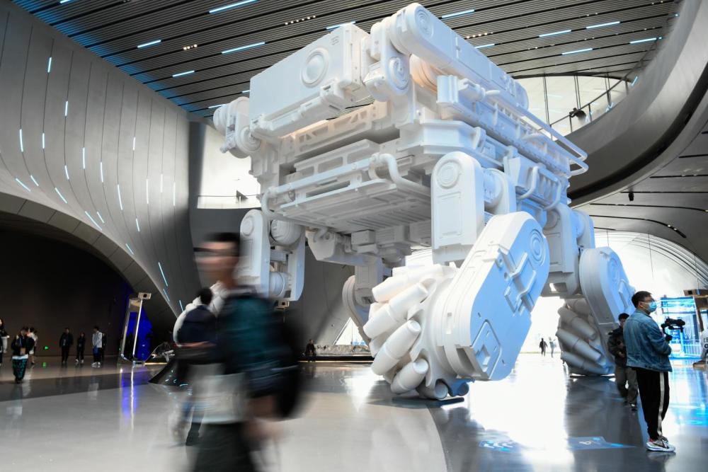 记者在主题展现场看到,“笨笨”在激光照射下还能变换不同的颜色风格,科技感满满。“我和孩子都喜欢电影中的‘笨笨’,没想到在大会上看到实物了,感觉很震撼!”专门带孩子来参观展览的科幻迷陈女士说。