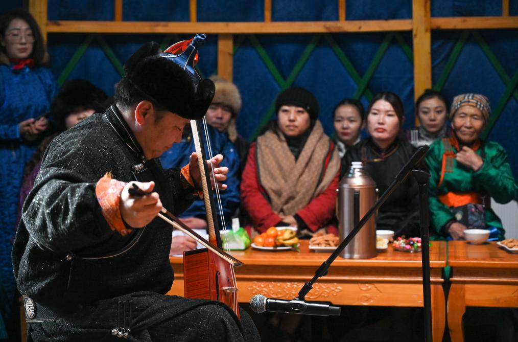 2023年12月21日,乌兰牧骑队员在阿其图乌拉苏木进行马头琴演奏表演。新华社记者 王楷焱 摄