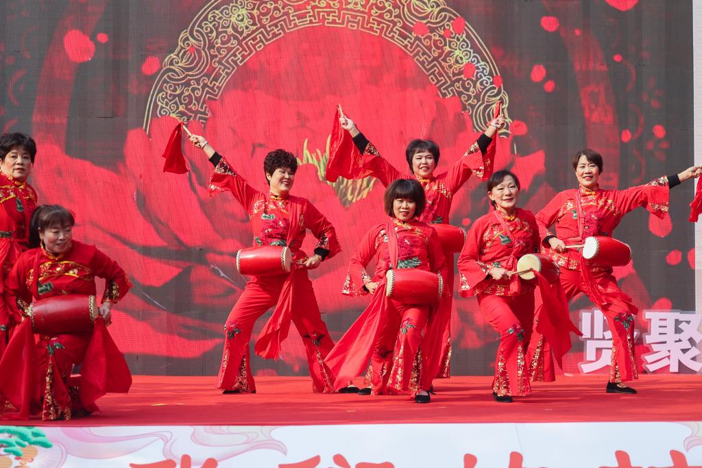 2023年12月28日,浙江省诸暨市赵家镇村民在村晚舞台上表演腰鼓。新华社记者 徐昱 摄