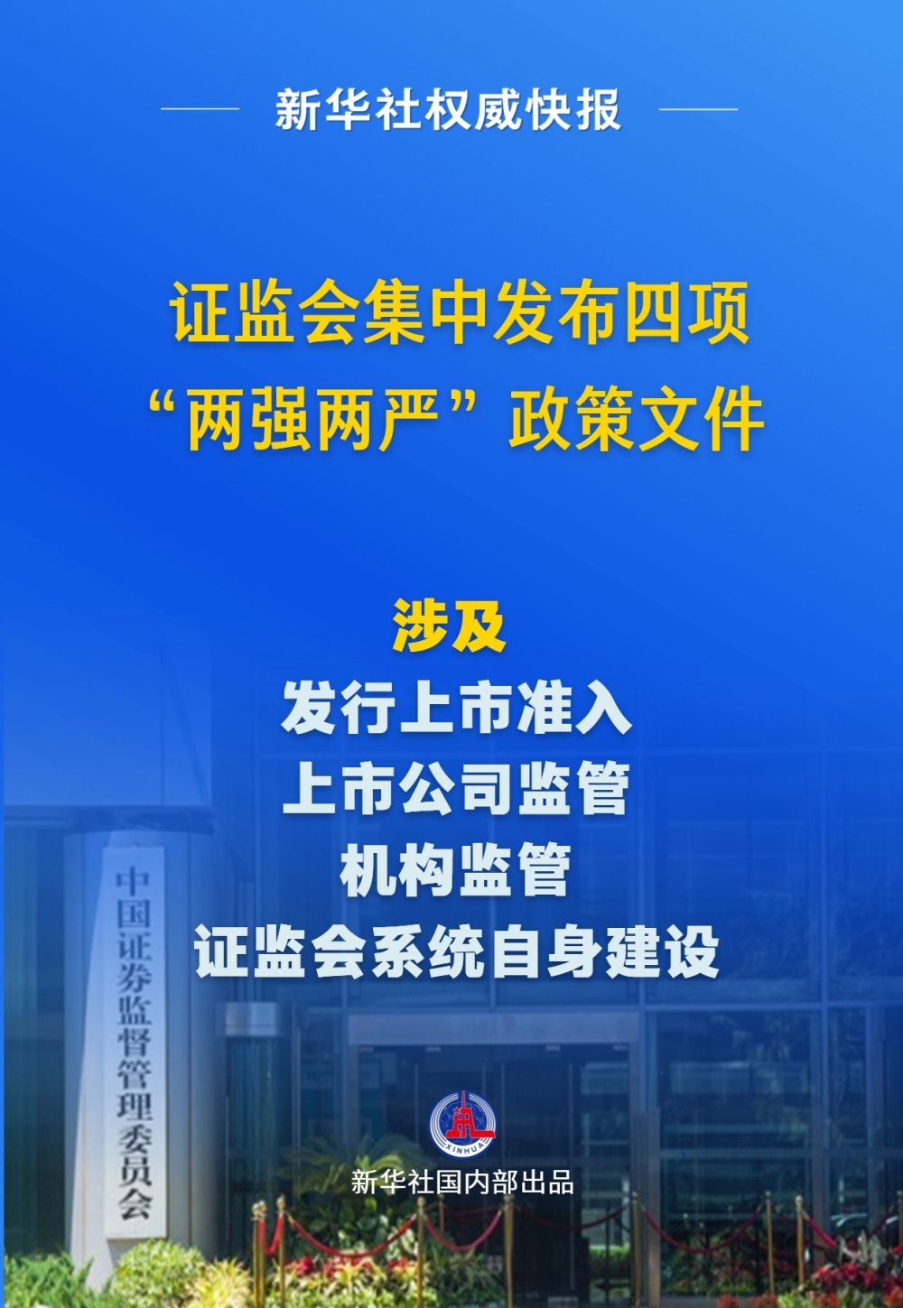 在15日举行的国新办新闻发布会上,证监会副主席李超宣布,发布《关于严把发行上市准入关从源头上提高上市公司质量的意见(试行)》《关于加强上市公司监管的意见(试行)》《关于加强证券公司和公募基金监管加快推进建设一流投资银行和投资机构的意见(试行)》《关于落实政治过硬能力过硬作风过硬标准全面加强证监会系统自身建设的意见》四项政策文件。上述四项政策文件中,前三项全文发布,第四项以新闻稿形式公布。