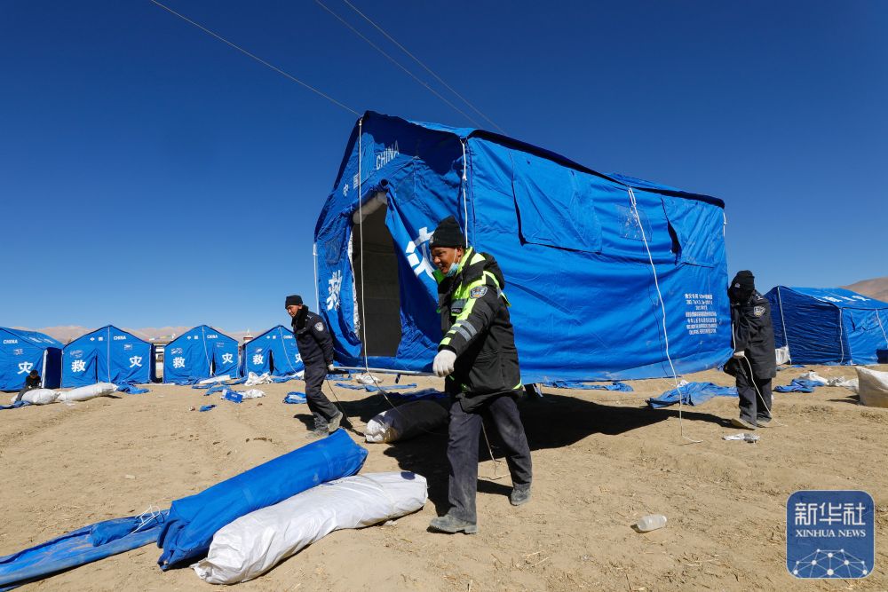 ↑1月8日,在日喀则市定日县措果乡雪珠村安置点,救援人员帮助受灾群众搭建帐篷。