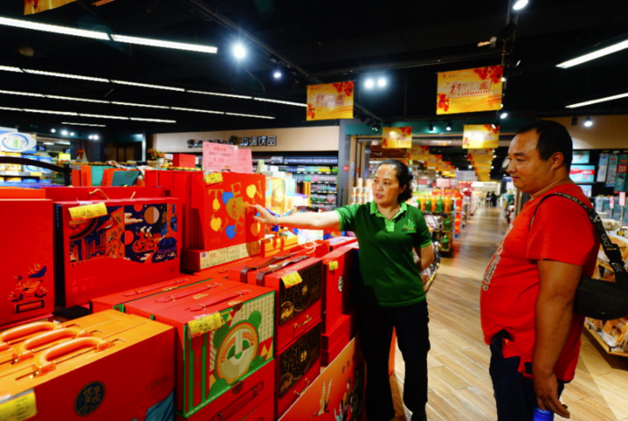 9月29日,记者走进位于遂宁万达广场的芙思特超市看到,西红柿、辣椒等新鲜蔬菜和水果琳琅满目,盒装、散装月饼被摆放在了显眼位置。一大早,不少市民穿梭往来,陆续到店购买商品。“超市货源充足,蔬菜天天上新,隔夜菜绝不上架。价格平稳,月饼还有促销,保准让市民过个舒心节。”该店相关负责人向记者介绍,为应对“双节”消费高峰,超市已提前与各级供货商敲定供货方案,确保生鲜、粮油、节日礼盒等商品持续补仓,完全能满足市民“一站式”采购需求。
