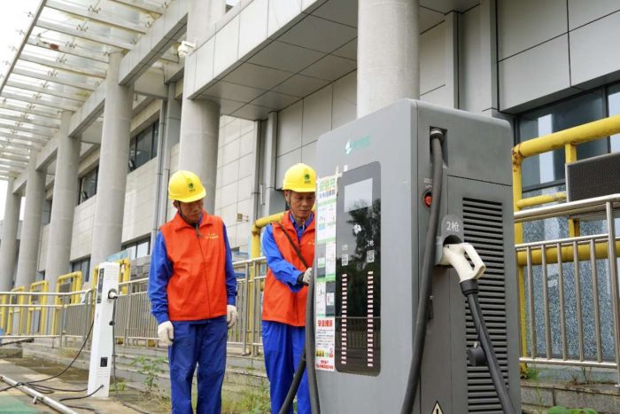 青神供电公司共产党员服务队队员检查高铁站新能源汽车充电桩。(敖洋 摄)