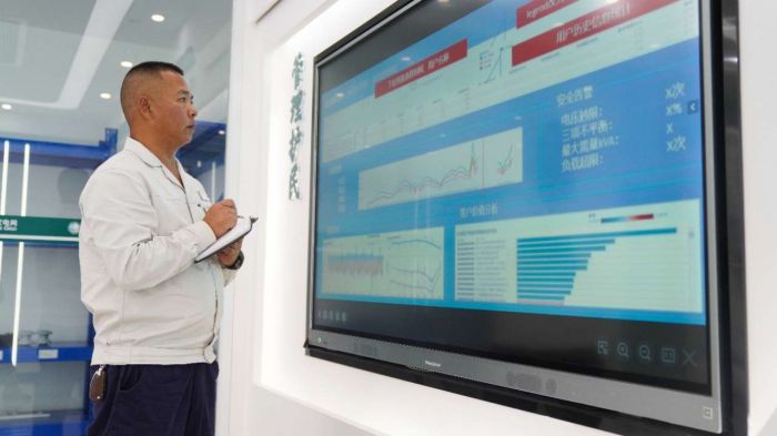 10月1日,国网眉山供电公司“数智护粮”保电分队负责人刘刚正通过数智永丰监测系统查看用户负荷情况。(胡晋 摄)