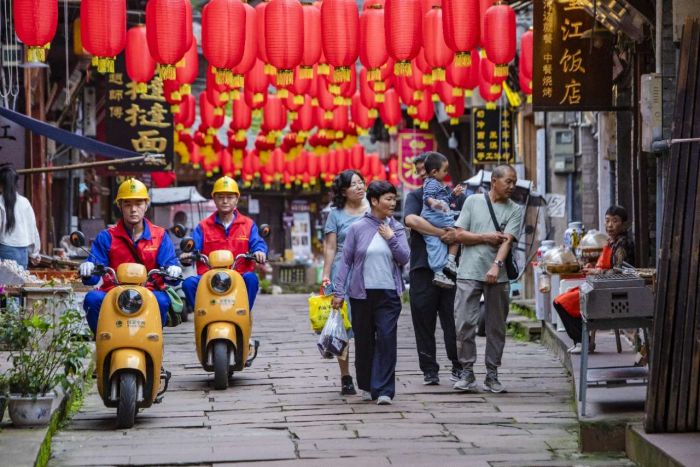 在眉山市洪雅县柳江古镇,国家电网四川电力(眉山洪雅)连心桥共产党员服务队队员佘星辰、余洪骑着“电马儿”对核心景区配电线路进行巡视,检查电力设备安全,确保“双节”期间古镇旅游用电无忧。(王鸿飞摄)