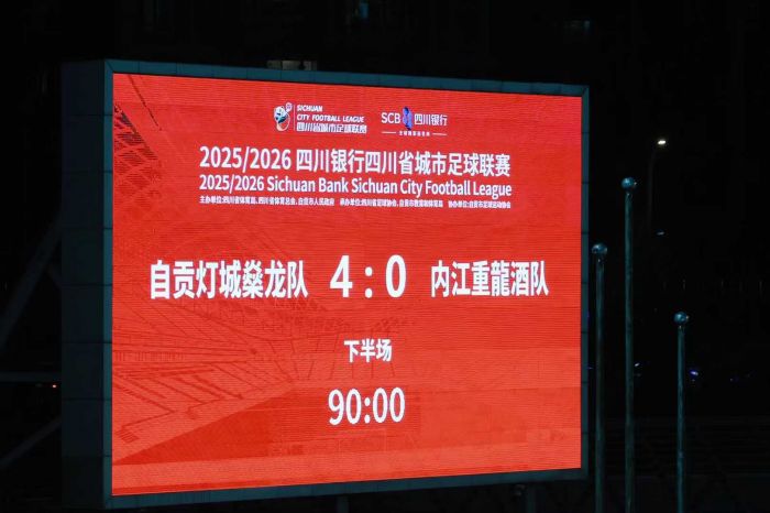 四川经济网自贡讯(陈思燕 记者 陈家明 文/图)10月1日晚,2025四川省城市足球联赛川南赛区迎来一场焦点对决,自贡灯城燊龙队主场迎战内江重龍酒队。经过90分钟的鏖战,最终,自贡队凭借5号球员、10号球员、20号球员和41号球员的多点开花,4比0完胜对手。