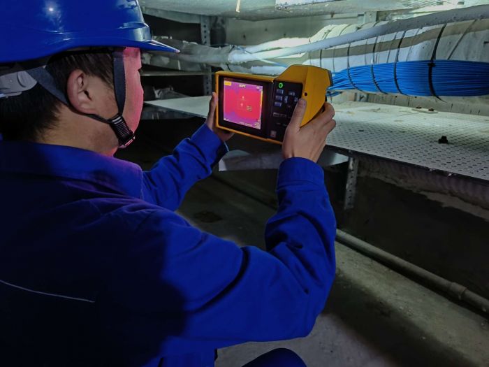 当天的特巡工作以“人巡+机巡”方式展开。“几条电缆的中间,都有一段很粗的“鼓包”,这里是电缆中间接头,是重点检查的位置。它的外部设置了很多测温光纤,一旦温度异常,超细干粉灭火弹会自动触发动作。”张勇一边用红外测温仪测量电缆接头运行情况,一边向杨伟介绍。