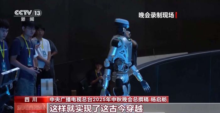 中央广播电视总台2025年中秋晚会总撰稿杨启舫说:“我们会在一个节目里用古老的青铜大面具、大立人来和代表着未来科技的机器人对话,这样就实现了古今穿越和跨越的这么一种表现方式。”