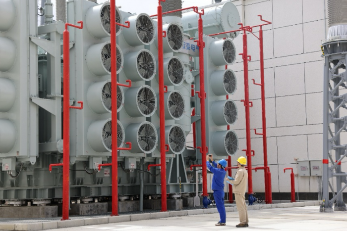 在甘孜1000千伏特高压变电站,运行维护班人员伍贤春、赖俊吉观测主变运行状态(李威 摄)
