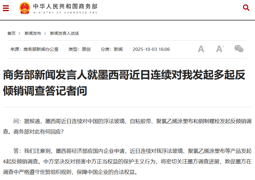 问:据报道,墨西哥近日连续对中国的浮法玻璃、自粘胶带、聚氯乙烯涂塑布和钢制螺栓发起反倾销调查。商务部对此有何回应?