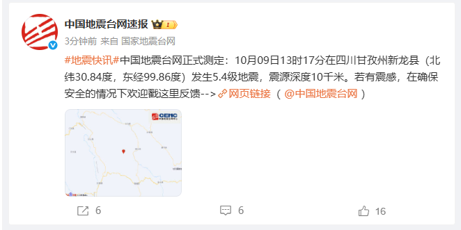 中国地震台网正式测定:10月9日13时17分在四川甘孜州新龙县(北纬30.84度,东经99.86度)发生5.4级地震,震源深度10千米。