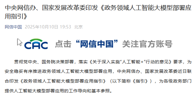 贯彻党中央、国务院决策部署,落实《关于深入实施“人工智能+”行动的意见》要求,为安全稳妥有序推进政务领域人工智能大模型部署应用,中央网信办、国家发展改革委近日联合印发《政务领域人工智能大模型部署应用指引》(以下简称《指引》),为各级政务部门提供人工智能大模型部署应用的工作导向和基本参照。