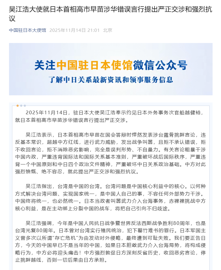 2025年11月14日,驻日本大使吴江浩奉示约见日本外务事务次官船越健裕,就日本首相高市早苗涉华错误言行提出严正交涉。
