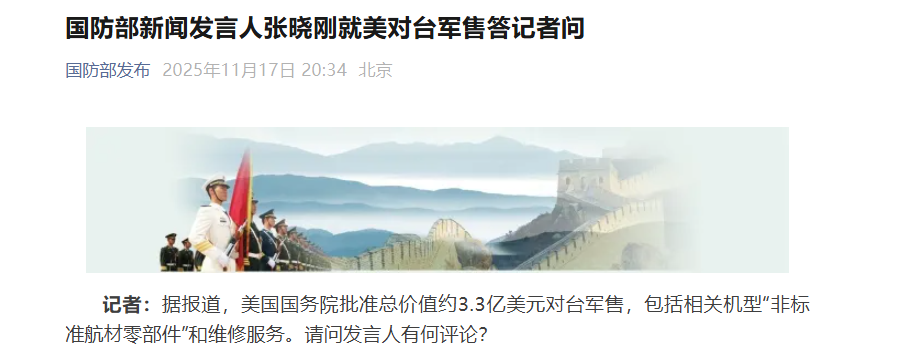 记者:据报道,美国国务院批准总价值约3.3亿美元对台军售,包括相关机型“非标准航材零部件”和维修服务。请问发言人有何评论?