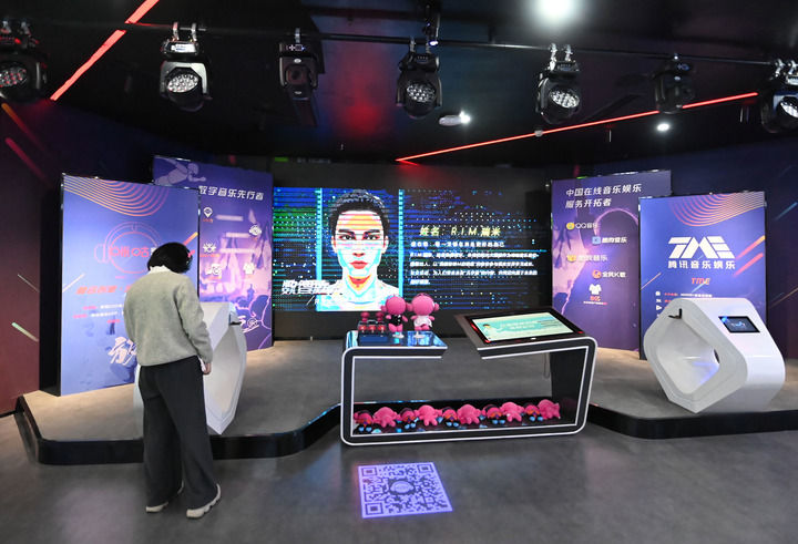 在成都市天府长岛数字文创园拍摄的腾讯音乐娱乐的展台。新华社记者 肖潇摄
