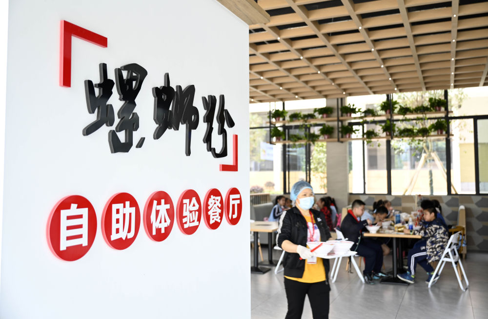 在广西柳州螺蛳粉产业园,参加研学团的学生在一家螺蛳粉企业里品尝螺蛳粉。新华社发(黎寒池 摄)