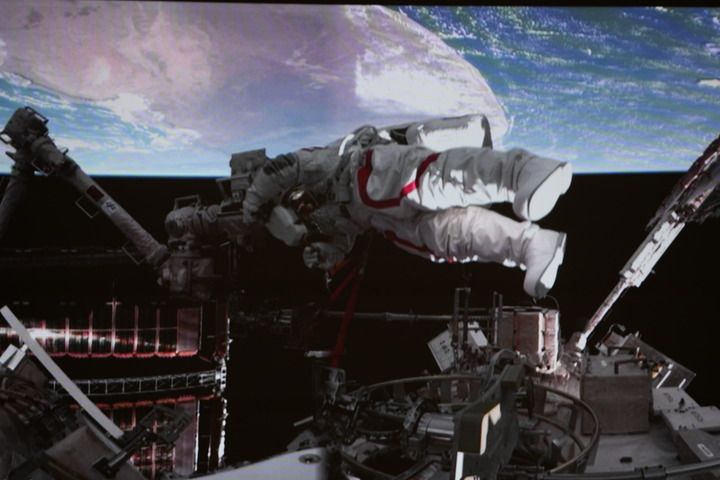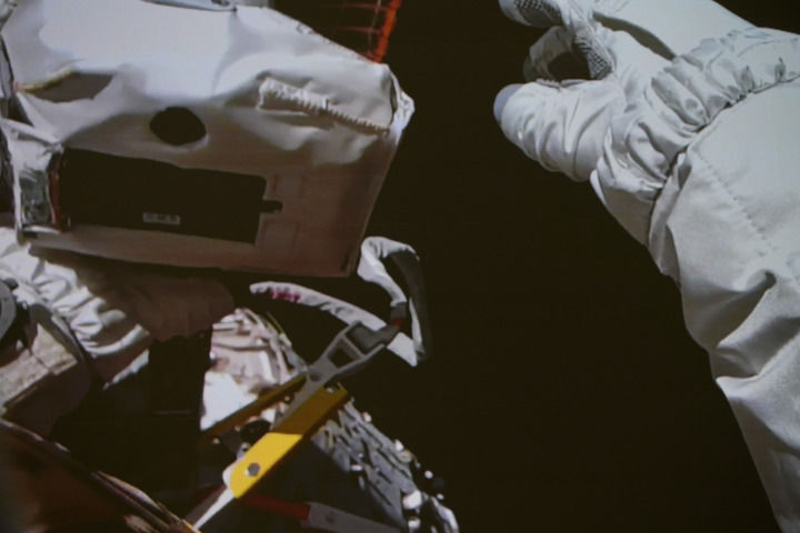 ↑这是12月9日在北京航天飞行控制中心屏幕上拍摄的神舟二十一号乘组航天员张陆在舱外工作的画面。新华社记者 刘艺 摄