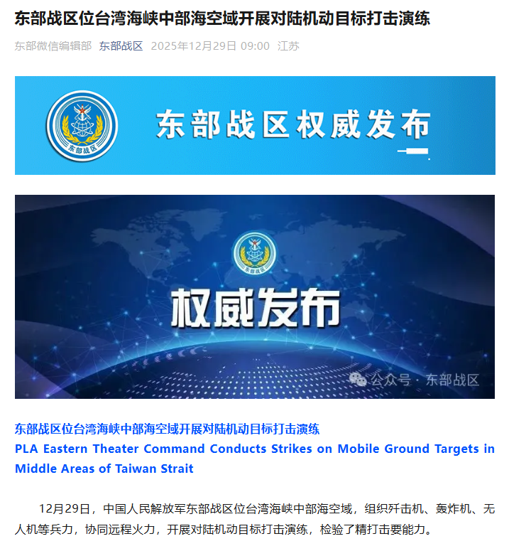 12月29日,中国人民解放军东部战区位台湾海峡中部海空域,组织歼击机、轰炸机、无人机等兵力,协同远程火力,开展对陆机动目标打击演练,检验了精打击要能力。
