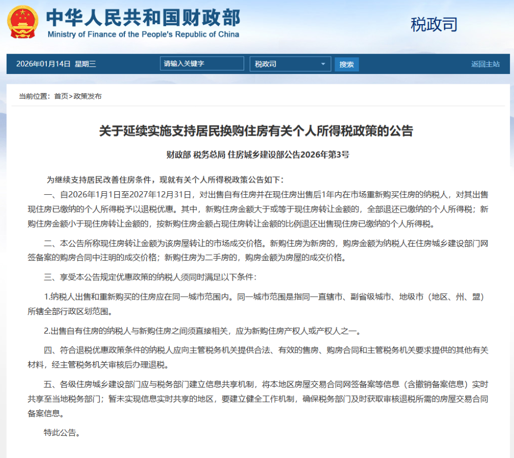 一、自2026年1月1日至2027年12月31日,对出售自有住房并在现住房出售后1年内在市场重新购买住房的纳税人,对其出售现住房已缴纳的个人所得税予以退税优惠。其中,新购住房金额大于或等于现住房转让金额的,全部退还已缴纳的个人所得税;新购住房金额小于现住房转让金额的,按新购住房金额占现住房转让金额的比例退还出售现住房已缴纳的个人所得税。