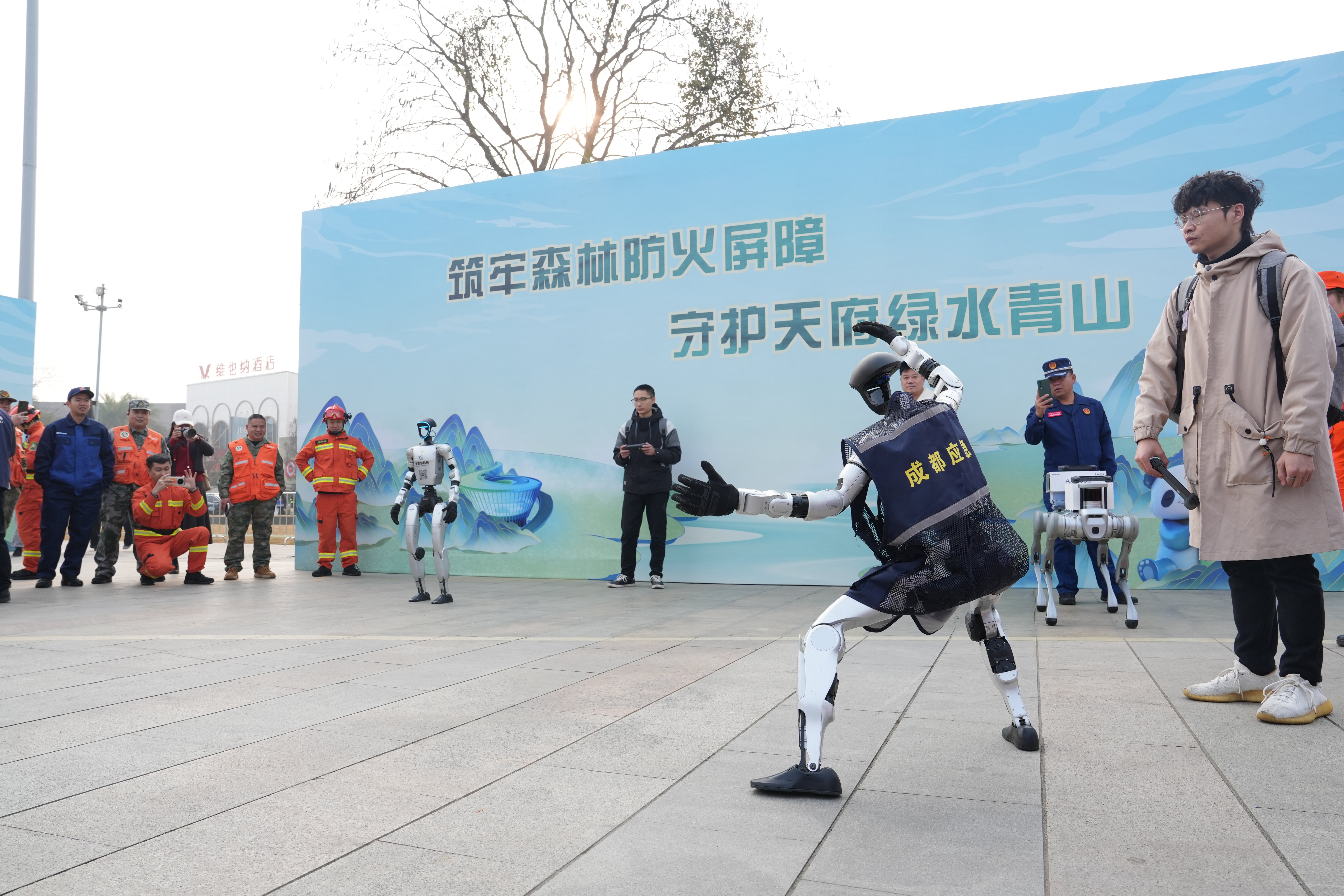 现场装备展示区内,40余种轻重型前沿科技装备整齐陈列,具身智能机器人、尾座式无人机、空投精确制导灭火弹等空天地的装备一应俱全,其中浇灌式空中以水灭火装置引起现场群众关注。据介绍,它配备了快速注水接口,70公斤水可在10秒内加注完毕,在30秒内喷洒形成暴雨式覆盖效果,800米内单次作业循环仅需90秒,可以悬停在悬崖等复杂地形,实现精准浇灌作业,极大提升了灭火效率。