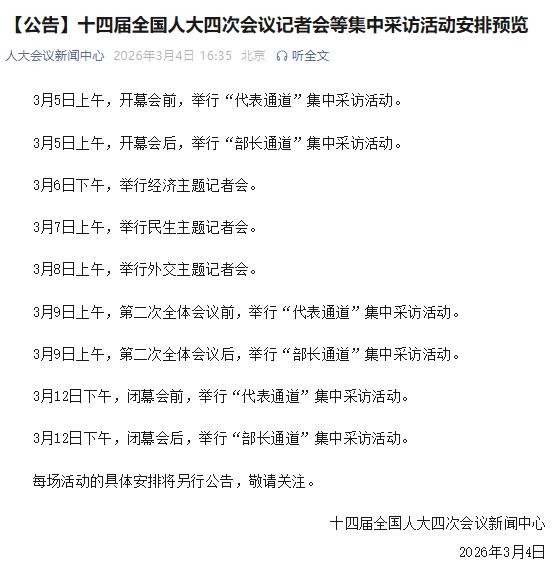 【公告】十四届全国人大四次会议记者会等集中采访活动安排预览