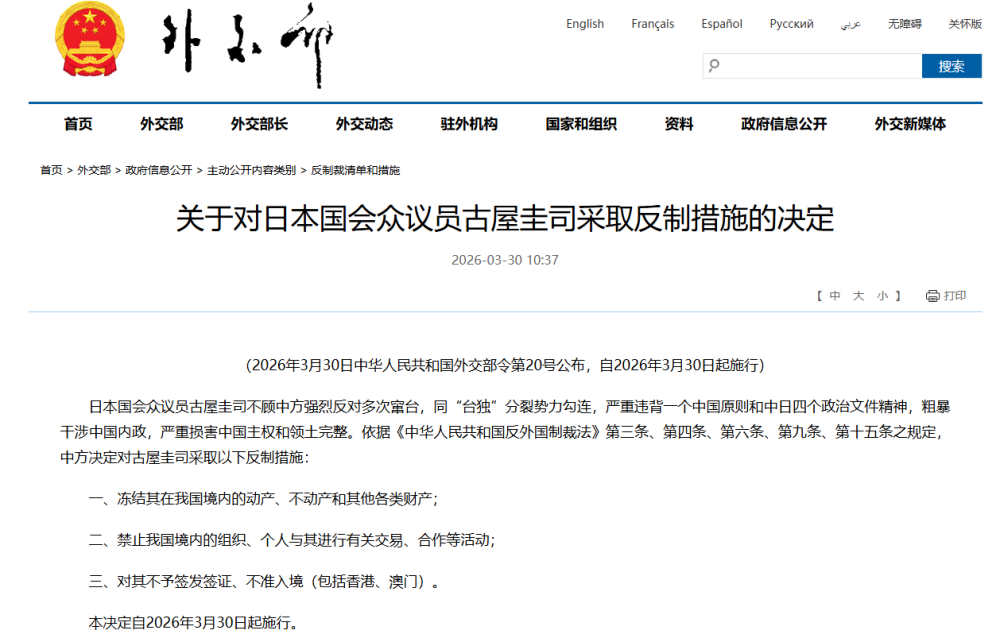 日本国会众议员古屋圭司不顾中方强烈反对多次窜台,同“台独”分裂势力勾连,严重违背一个中国原则和中日四个政治文件精神,粗暴干涉中国内政,严重损害中国主权和领土完整。依据《中华人民共和国反外国制裁法》第三条、第四条、第六条、第九条、第十五条之规定,中方决定对古屋圭司采取以下反制措施:
