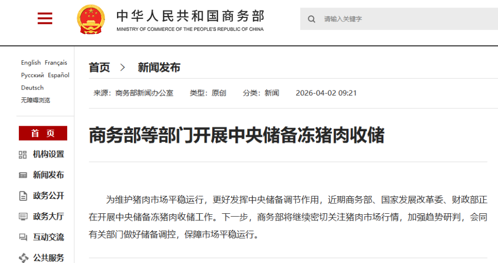 为维护猪肉市场平稳运行,更好发挥中央储备调节作用,近期商务部、国家发展改革委、财政部正在开展中央储备冻猪肉收储工作。下一步,商务部将继续密切关注猪肉市场行情,加强趋势研判,会同有关部门做好储备调控,保障市场平稳运行。