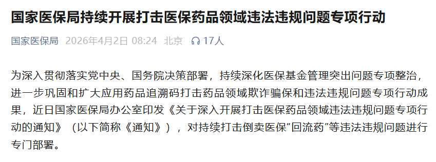 为深入贯彻落实党中央、国务院决策部署,持续深化医保基金管理突出问题专项整治,进一步巩固和扩大应用药品追溯码打击药品领域欺诈骗保和违法违规问题专项行动成果,近日国家医保局办公室印发《关于深入开展打击医保药品领域违法违规问题专项行动的通知》(以下简称《通知》),对持续打击倒卖医保“回流药”等违法违规问题进行专门部署。