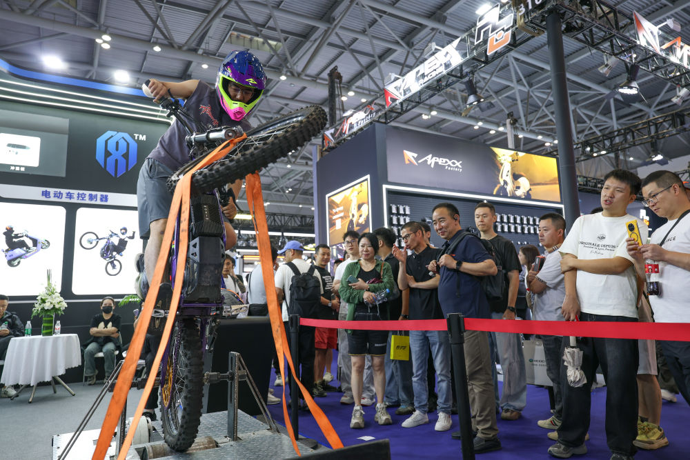 2025年9月,观众在重庆摩博会现场体验国产新能源摩托车控制器自动翘头功能。新华社记者 陈诚 摄