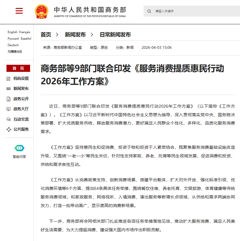 商务部等9部门联合印发《服务消费提质惠民行动2026年工作方案》